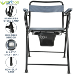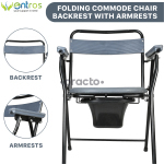 Entros Commode Foldable Chair With Armrest & Backrest (C779B) Oval Cut has non-skid rubber tips and metal framework, making it both sturdy and durable. It is durable and can be cleaned easily by wiping with a wet cloth. It also comes with a back rest and armrests for extra support and comfort.